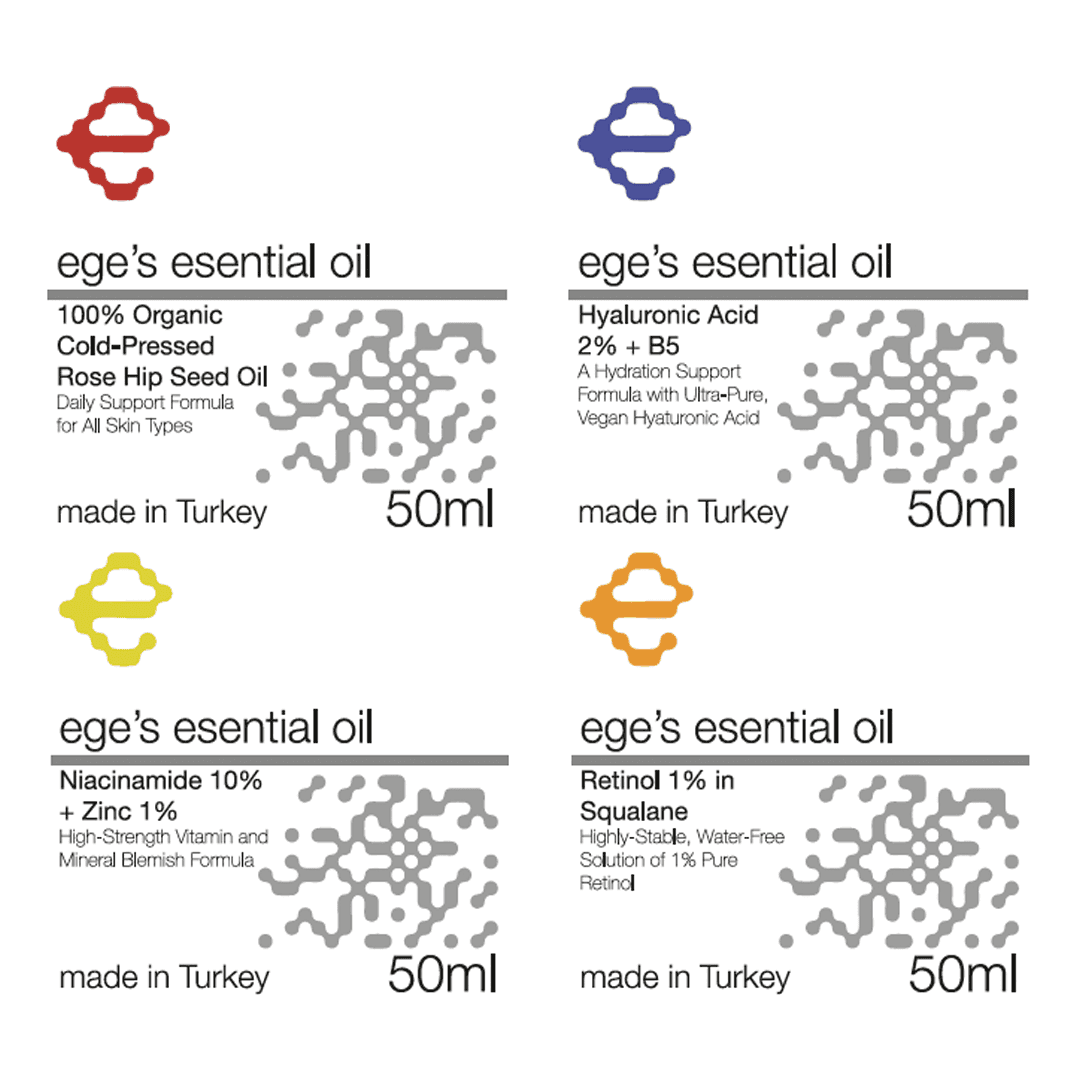 Ege’s Essential Oils is a school project exploring how packaging design can communicate product identity through color and form. Each bottle features a custom accent color aligned with its key ingredient (Red for rose hip seed oil, blue for hyaluronic acid, yellow for niacinamide, and orange for retinol.) creating an intuitive visual system that supports quick recognition and brand coherence. The project combines minimal typography with expressive color accents to balance clarity and aesthetics, demonstrating how thoughtful packaging design can enhance user experience while maintaining a cohesive beauty brand identity.